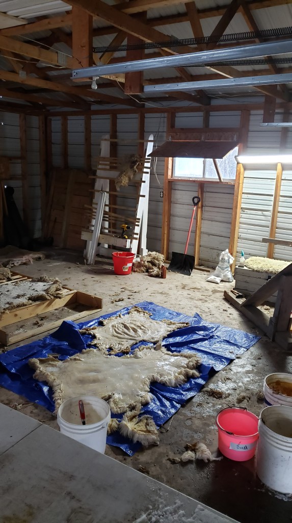 I’ll hand-stretch the shearling, but the full-fleeced hide will have to go on a frame; it’s the only way I can imagine the wool will dry. It’s just so wet still, and not going to dry easily in this freezing, snowy weather we’ve been gifted.