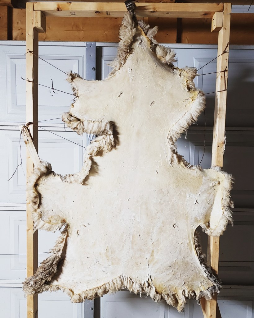 The large wooly hide is wet scraped as much as I felt like doing. The shearling, ditto.