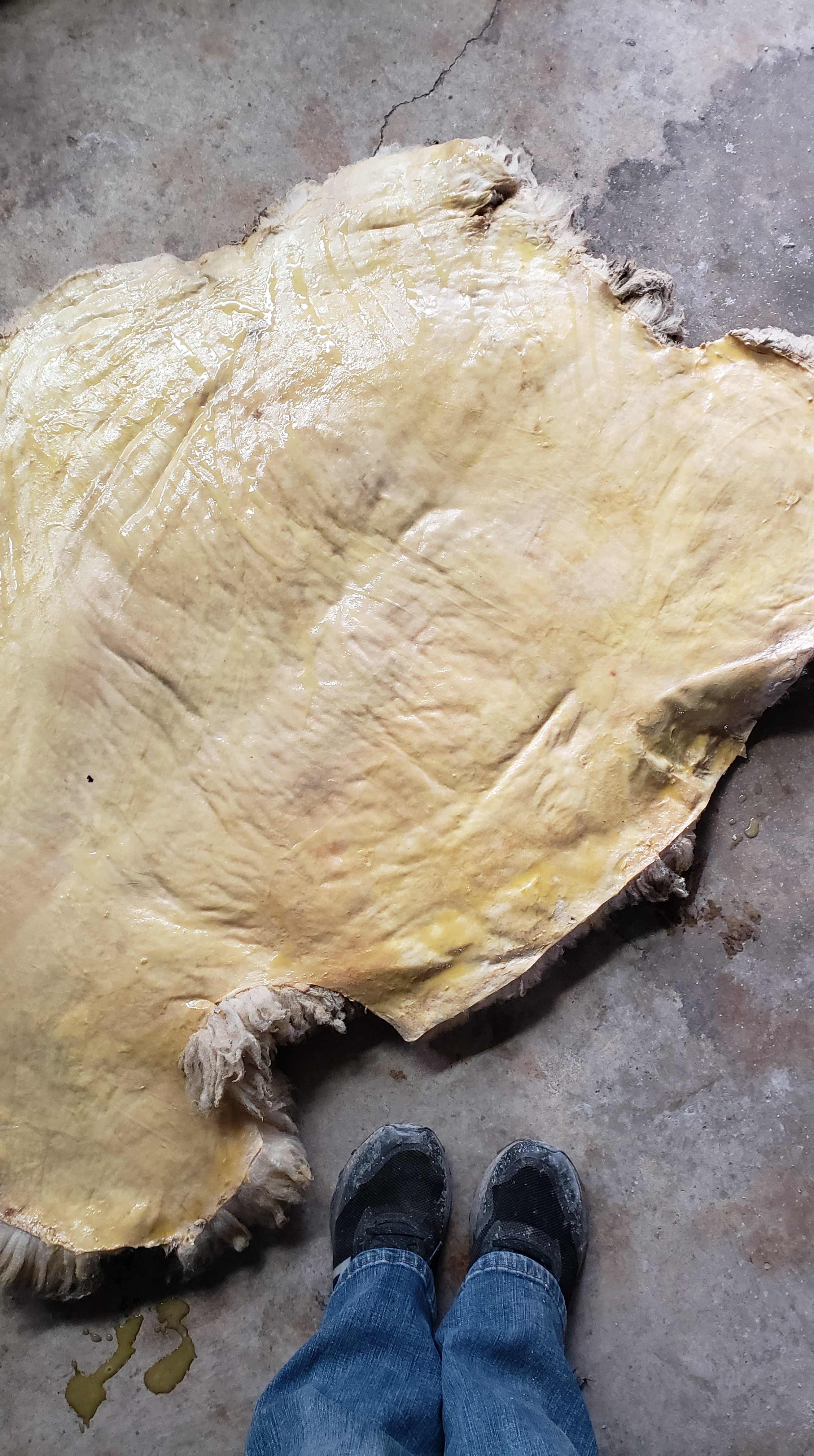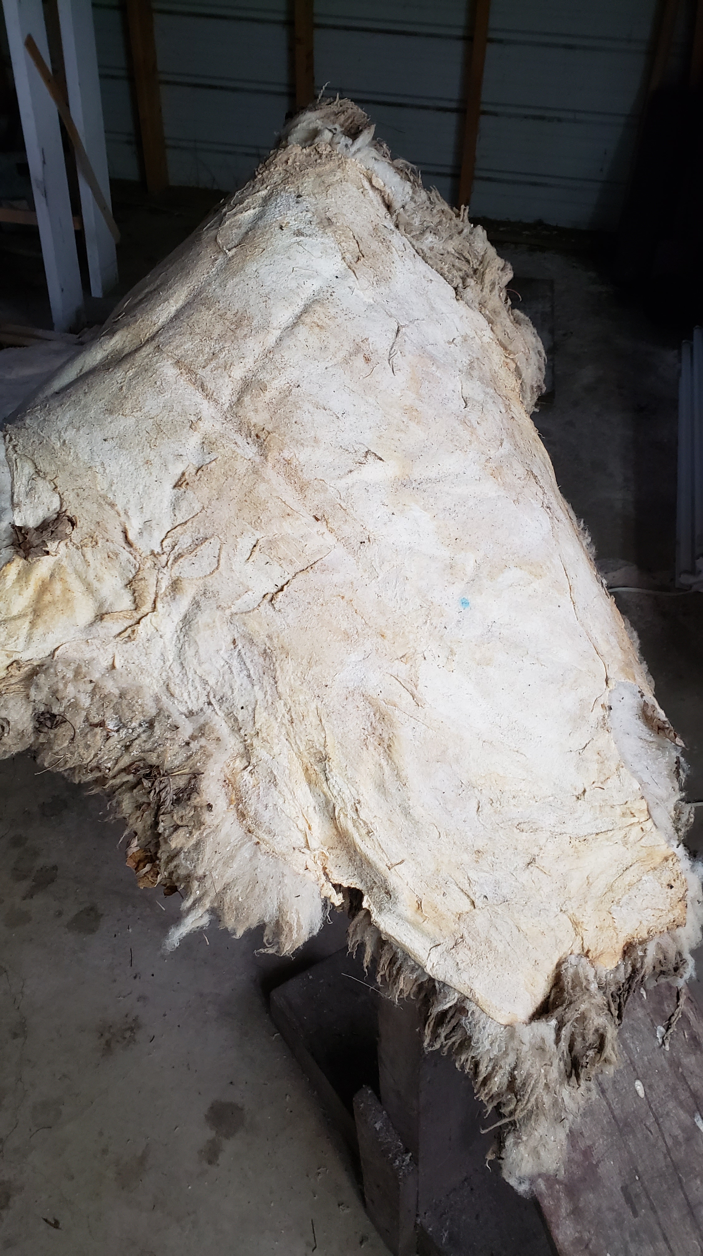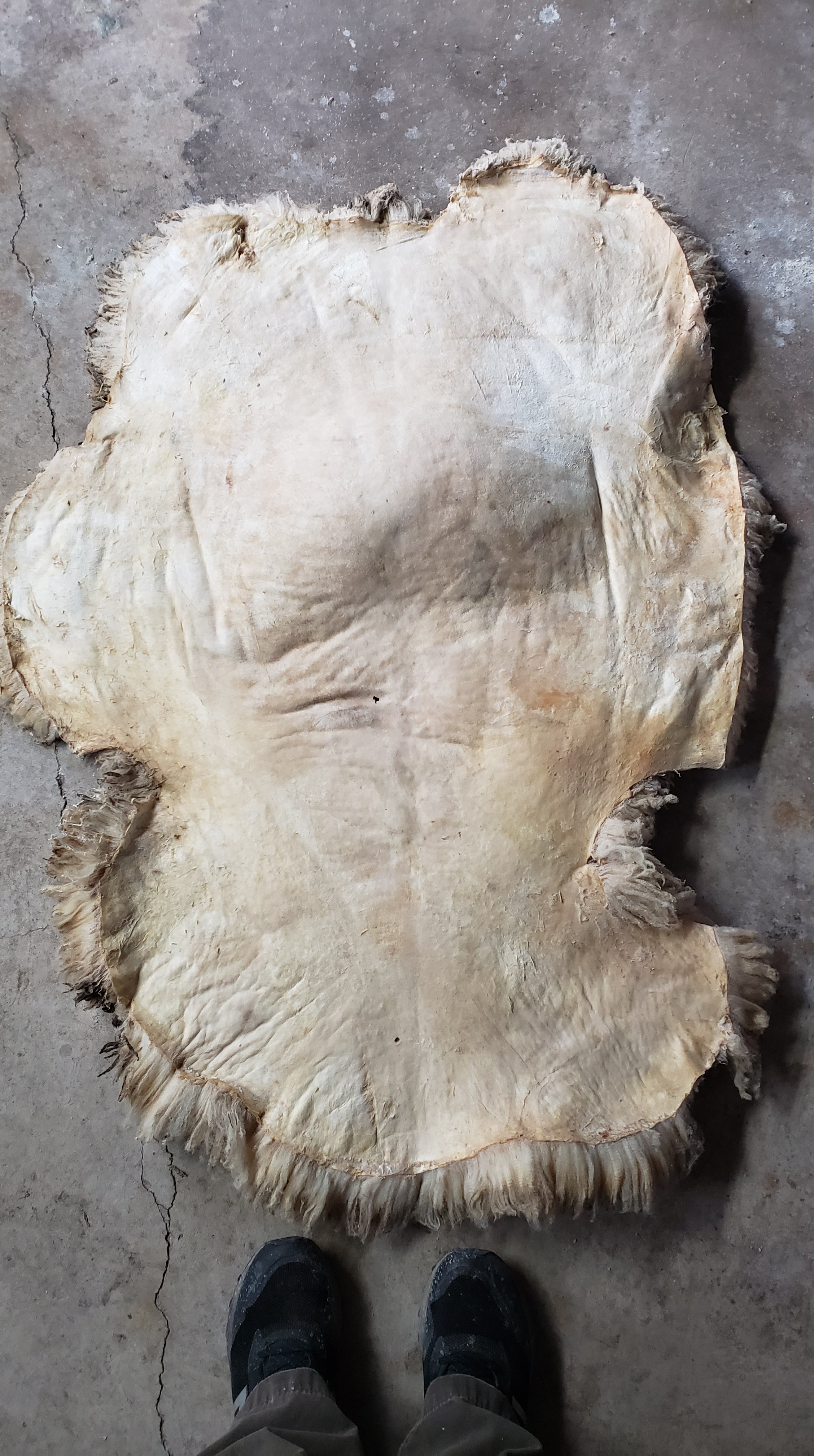 My last task for today was to select the next hide. It’s a sheepskin that’s looking pretty rough and wasn’t fully fleshed before salting.