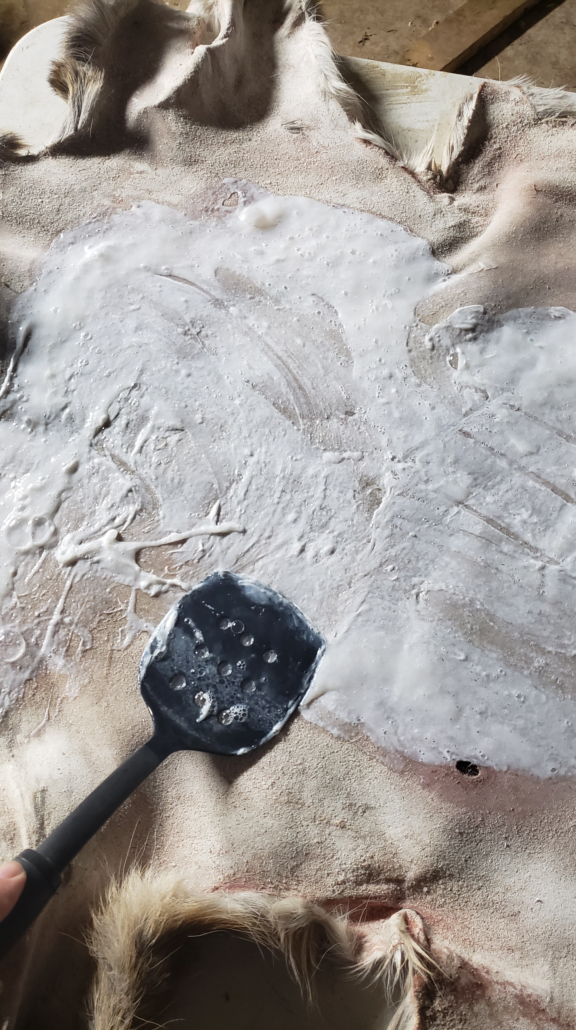 Tonight I had just enough time to get another round of tanning dressing on the custom deer. It had dried nicely under salt, especially after I rolled it up and brought it into my house overnight.