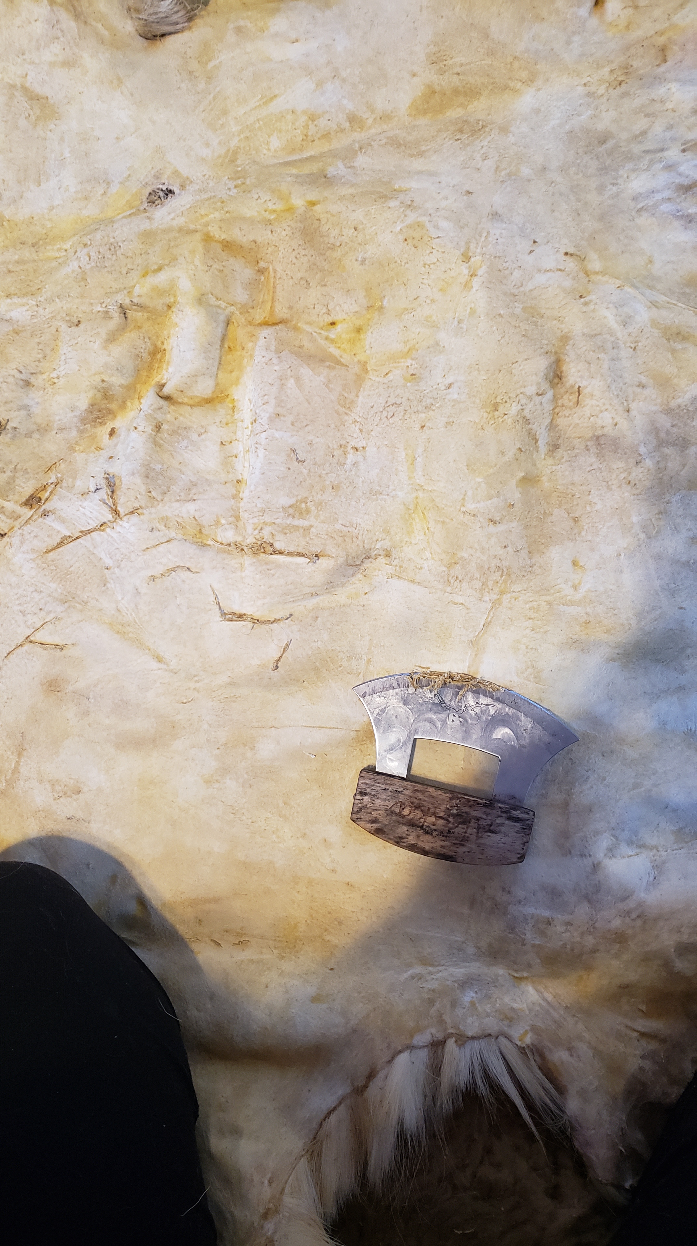 The egg dressing had dried, which i normally wouldn’t let happen completely but, ya know, 6- month-old baby. I used a rag and some warm water to dampen it a bit. Then went to work scraping first with my small knife, then with my ulu.