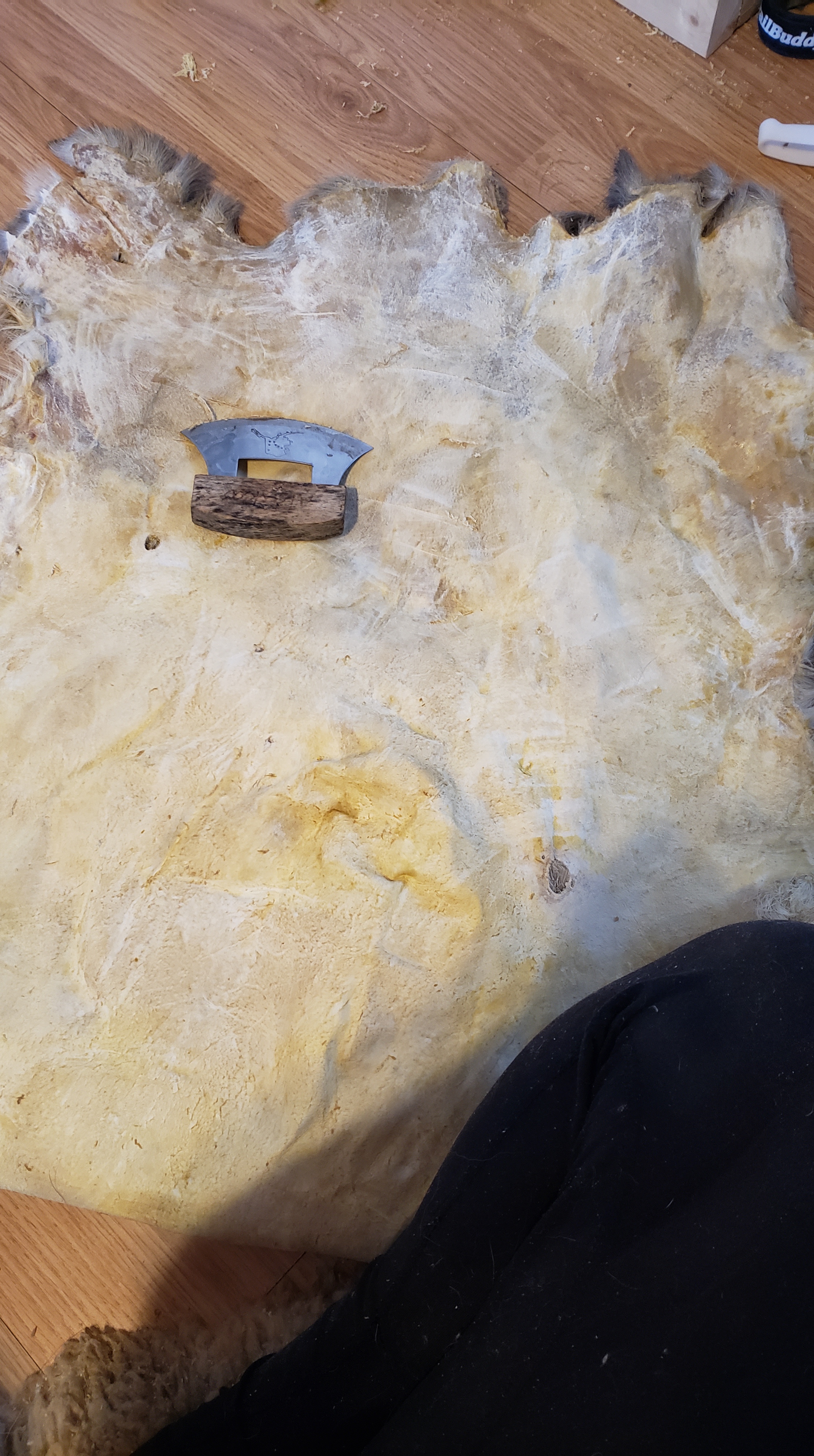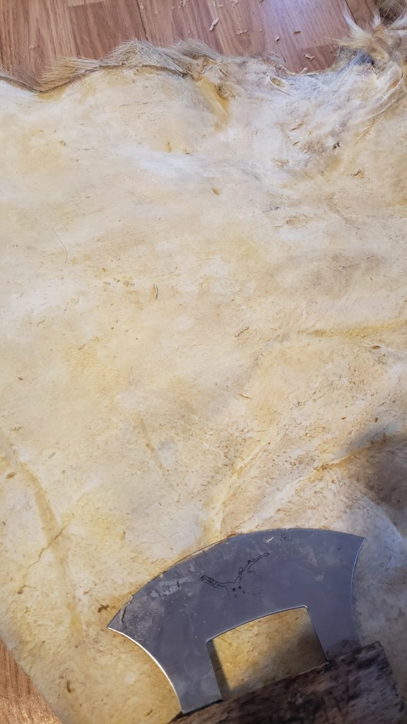 I used different angles. Held the hide folded and scraped the edge. Pulled it tight and scraped in the opposite direction. Pushed into all the nooks and crannies. Opened up the parts that wanted to fold. Knelt on it and scraped away from myself, using my weight to hold it tight. Held my blade sometimes at a right angle, sometimes at a steep, slicing angle.