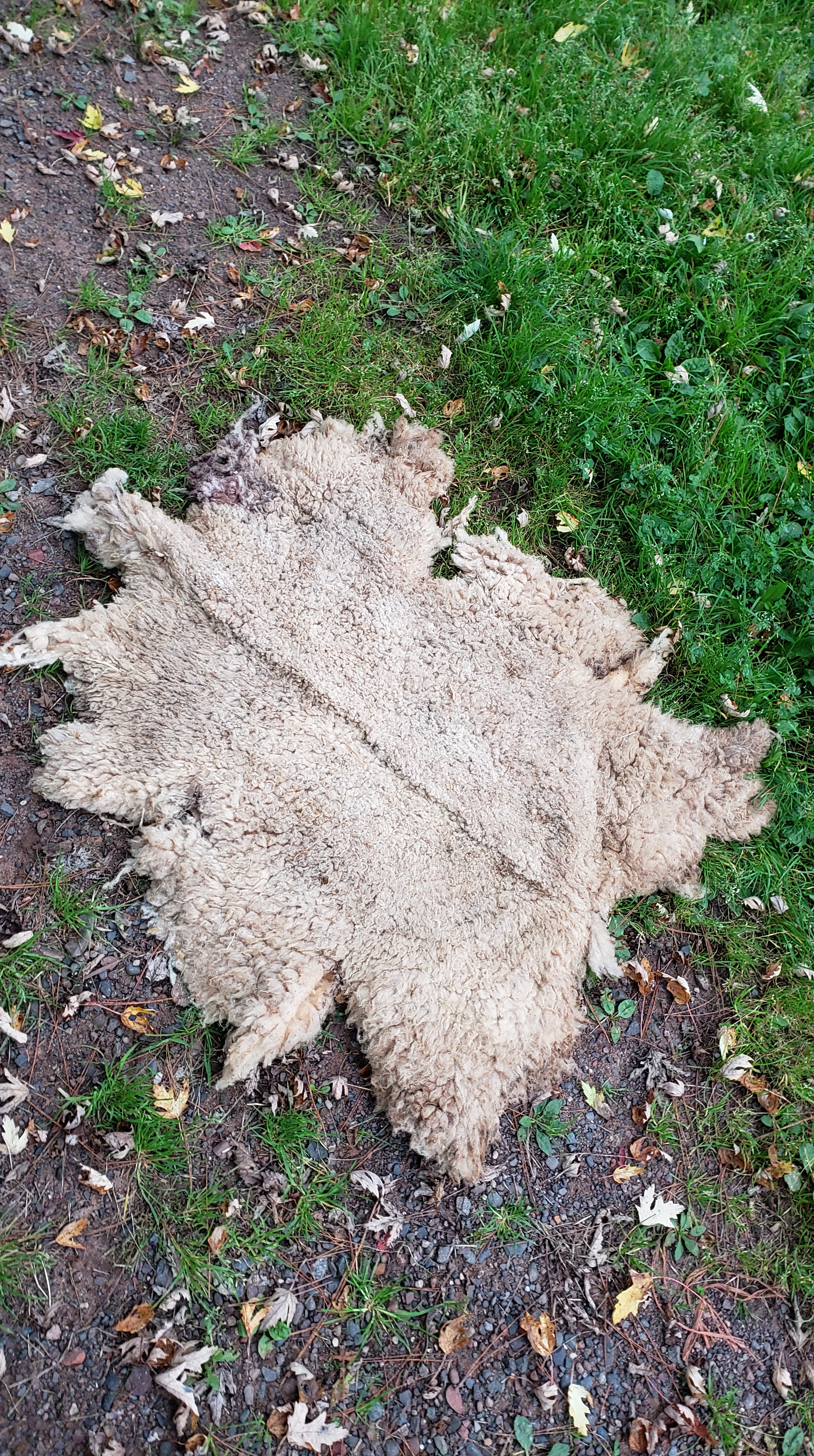This skin is large, the wool thick and long and creamy. The dried blood in the nape has long oxidized to purple. It still smells exactly like one of my sheep, and I’m hit with a pang of nostalgia as I think about my empty barn, which now houses only a riding mower and, probably, mice.