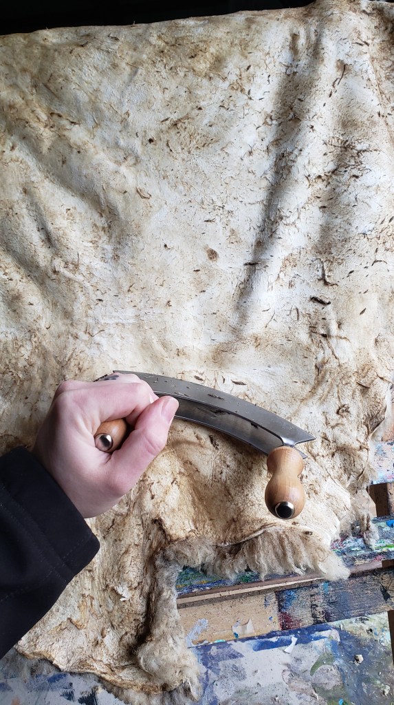 Today I worked on one of the shearling skins that I tawed and tanned in ’19. I didn’t remove all of the membrane, which is the very thin layer of peel-away epidermis on top of the skin that gets nice and smooth and soft when turned to leather. Removing the membrane is part of the fleshing and scraping/breaking/softening processes.