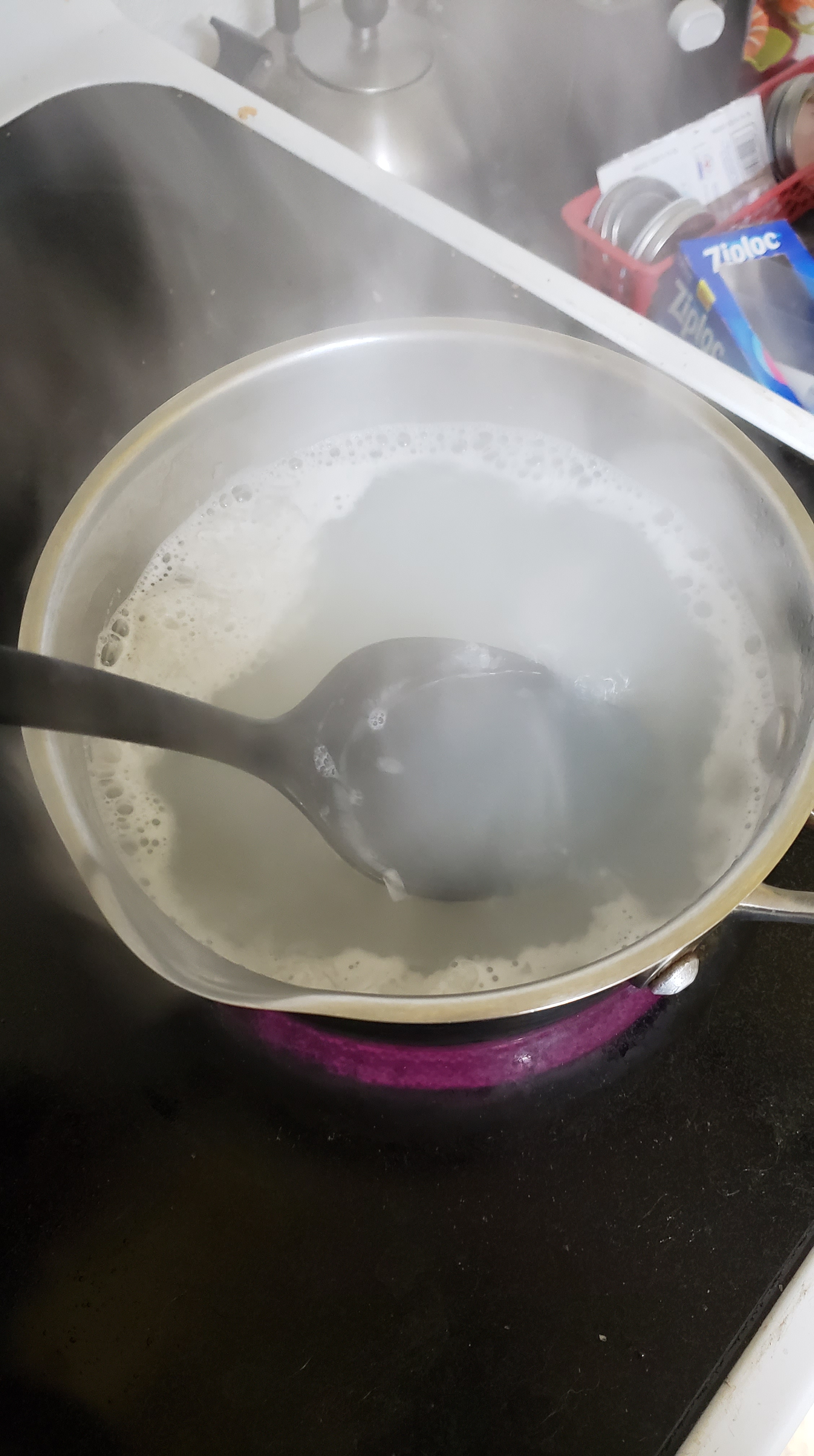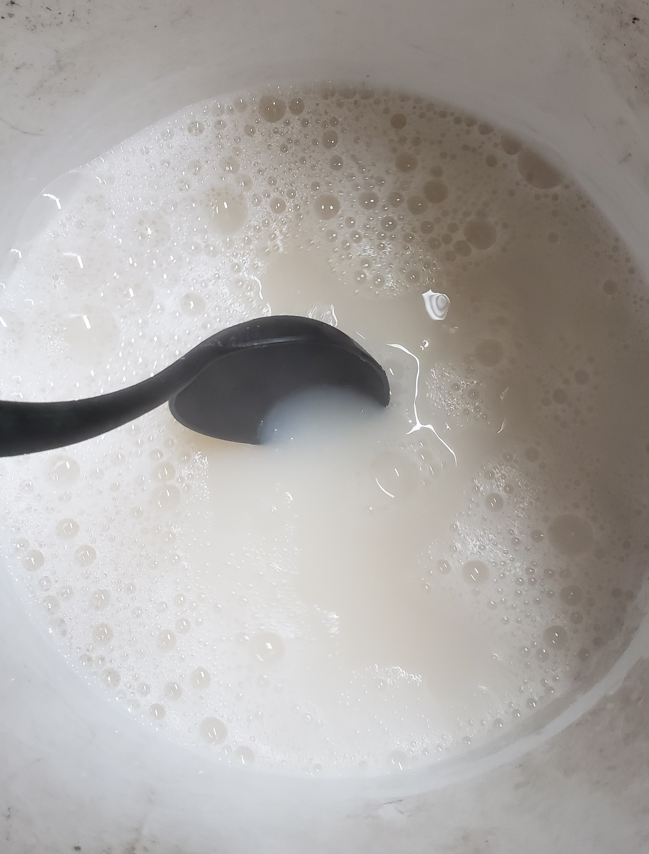 I keep stirring with the pot on the heat until all the soap is dissolved. For those playing along at home, the mixture will be cloudy, slightly bubbly, and still water-thin at this point.