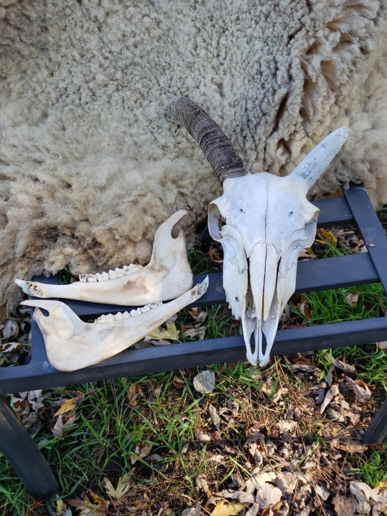 Skull of my Jacob ewe, Wild Thing. Jumper of fences, wanderer of the woods, climber of hay bales, my scrappiest ewe. We butchered her in 2019. The skull was cleaned by mother nature and bleached in the sun. Lower jaw & 1 horn sheath included. Free shipping.
