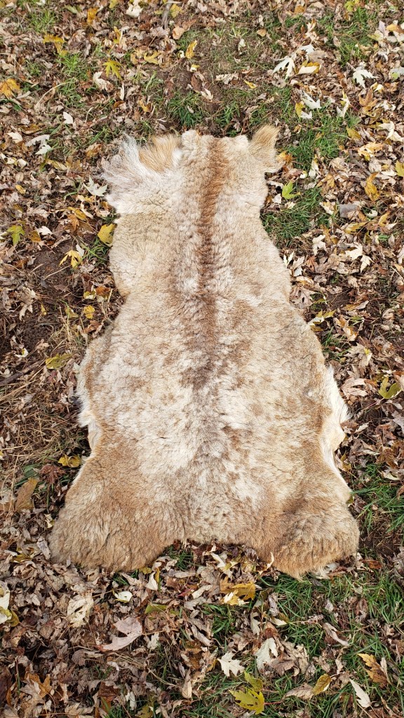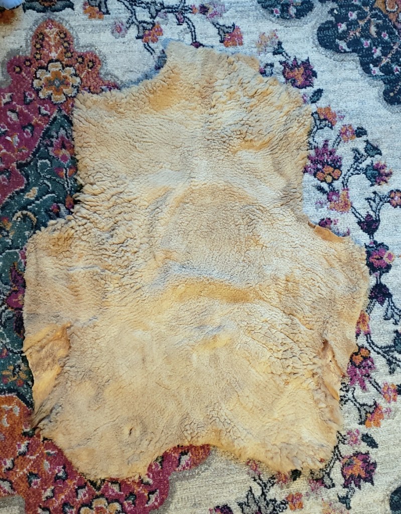She’s done… the first of the lot that started this blog. My first finished skin of 2021. Quite proud of this one! So nice to be tanning hides again. … The wool is over 4 inches long. I sewed up a couple cuts with waxed thread. Smoky and warm. Beautiful.