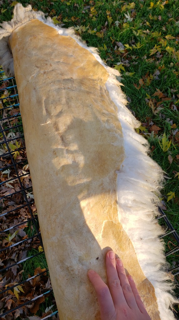 The sheepskin that started out this process “brittle” just isn’t quite up to my standards – towards the bottom of the hide, the hind leg area, the leather is still too brittle for my liking. It’s a fine hide for a seat cover or small rug, but I’m not going to offer it for sale because it just doesn’t represent my best and desired result.